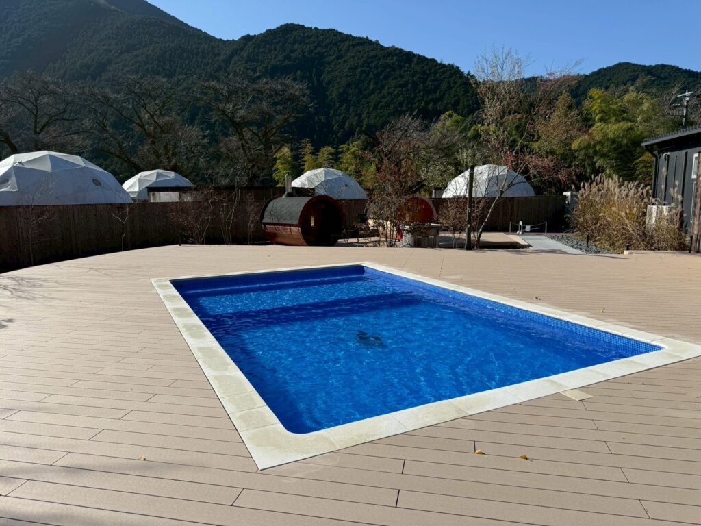 雄大な山々に囲まれたグランピング施設内に、宿泊者が四季を通して楽しめる屋外プールエリアを新設しました。
